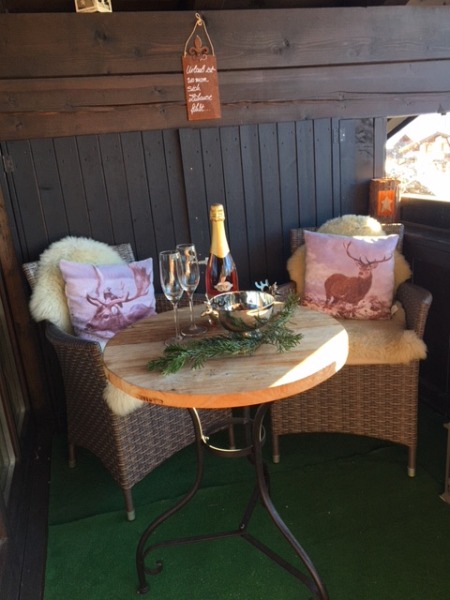 Durch die großflächig in Raumhöhe Verglasung geht es auf den großen, überdachten sonnigen Süd-West Balkon der mit Sitzmöbeln und Tisch sowie Liegestühlen ausgestattet ist.