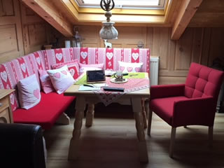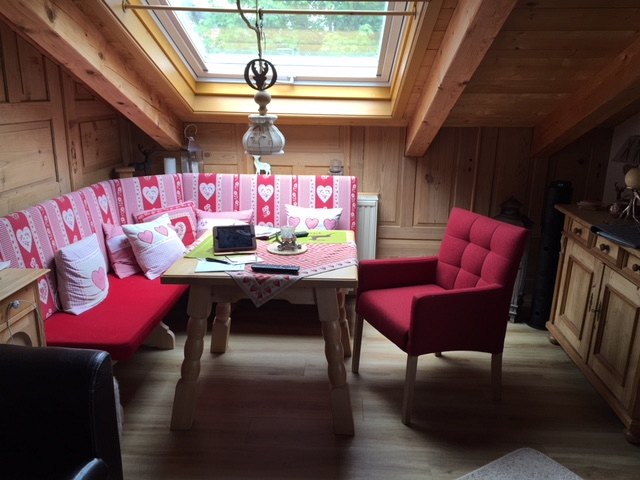 Heimelige Wohnstube mit gemütlicher Eckbank-Sitzecke, von dem Sie schon beim Frühstück den herrlichen Blick in die Bergwelt genießen können, eine hochwertige Couch die Sie auch als zusätzliche Schlafcouch ( 140x200 ) nutzen können und der große Ohren-Backensessel der Sie zumwohlfühlen einlädt.